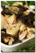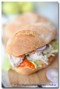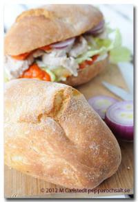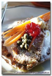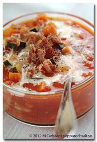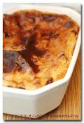 Smörj en liten långpanna med höga kanter eller motsvarande ugnsform. Häll ner smeten och grädda mitt i ugnen i 40 minuter. Täck om ytan får för mycket färg.